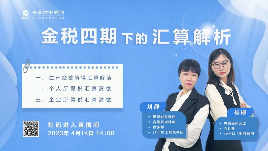 4月14日14時,安盛財務(wù)組織開展“安盛財稅云課堂”第七期——線上直播培訓(xùn)課《金稅四期下的匯算解析》,本次直播培訓(xùn)課邀請咨詢顧問中心劉靜老師和楊柳老師給大家進行精彩的講解。